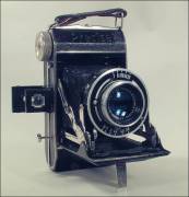 - Precisa II, um 1950 - erste Nachkriegsausführung - Klappkamera - Rollfilm 120 - 6x6 cm und mit Maske 4,5x6 cm - Meritar 1:3,5 - f=75mm - Vergütung - optischer Klappsucher - vermutlich Binor-Verschluss (B im Kreis ?) in eigenartiger Ausführung - Blitzanschluss sitzt auf der Frontseite und nicht wie gewohnt an der Aussen- seite des Verschlusses - Verschlusszeiten: T, B, 100,50, 25. - Drahtauslöseranschluss befindet sich am VerschlussFC